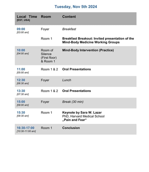Changes, rebookings and/or cancellations must be made by e-mail or letter to the Mind-Body Medicine Research Council (MBMRC), Institute for Integrative Health Care and Health Promotion (IGVF), Witten/Herdecke University, Alfred-Herrhausen-Straße 44, 58455 Witten, Germany, info@mbmrc.org.