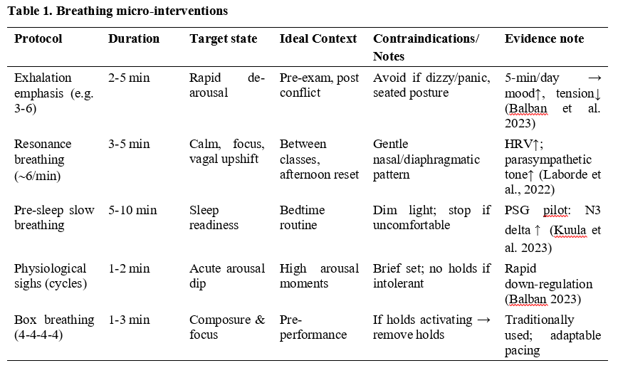 Here is where micro-interventions for breathing fill the gap: ultra-short, low-impact exercises lasting three to five minutes that young people can implement independently during transitional phases (after learning phases, before exams, in their evening routine). Young people need easy-to-use and effective self-regulation tools and precision breathing is exactly that. Slow, steady breathing at a rate of approximately 4.5–7 breaths per minute increases respiratory sinus arrhythmia, strengthens baroreflex dynamics and promotes vagal activity (Bentley et al., 2022). These effects have been consistently associated with calmed physical arousal, improved emotional control, and benign cardiovascular modulation (Laborde et al., 2022; Russo et al., 2017).