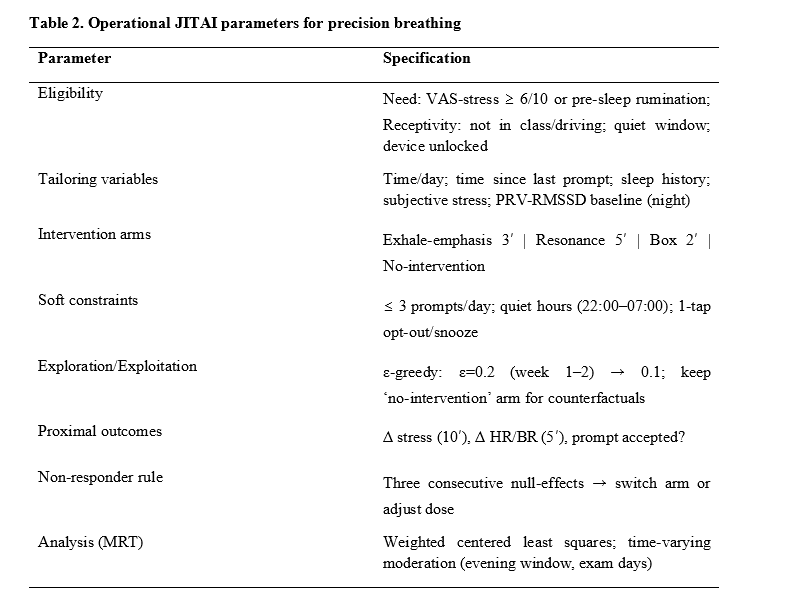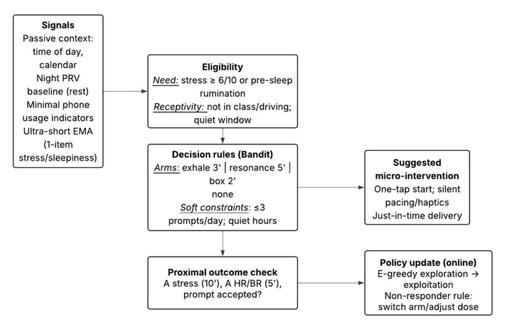 Figure 1. Just-in-time decision architecture for precise breathing in adolescence. The diagram links structural rhythms (school day, evening routines) with subjective self-regulation: Passive and minimal signals (time of day, calendar, nocturnal PRV baseline, ultra-short EMA) determine eligibility as a joint function of need (increased stress or rumination before bedtime) and receptivity (no competing demands). Decision rules operationalise a contextual bandit policy with a ‘non-intervention’ arm and soft constraints (≤3 prompts/day; rest periods) and select a microintervention (exhale 3′, resonance 5′, box 2′) that is discreet and executable with a tap of the finger. A proximal outcome check (Δ stress at 10'; Δ HR/BR at 5'; immediate acceptance) feeds into the policy update (exploration→evaluation; change/adjustment for non-responders).
