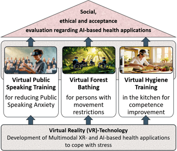 The project is divided into five work packages. Firstly, there is the technical part, which includes developing a toolbox containing multimodal XR- and VR-based health applications to help people cope with stress. The second package involves evaluating a VR-based intervention for reducing Public Speaking Anxiety. The third work package is related to virtual forest bathing for people with restricted mobility, with the aim of reducing their stress levels and increasing their sense of well-being. The fourth working package concentrates on kitchen hygiene training using VR-based instruction to increase competence and reduce the fear of contamination. The fifth work package focuses on social and ethical aspects as well as acceptance levels in the society regarding VR-based health applications. Fig. 1 provides an overview of the work packages of AI4Coping.