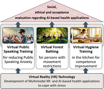 The project is divided into five work packages. Firstly, there is the technical part, which includes developing a toolbox containing multimodal XR- and VR-based health applications to help people cope with stress. The second package involves evaluating a VR-based intervention for reducing Public Speaking Anxiety. The third work package is related to virtual forest bathing for people with restricted mobility, with the aim of reducing their stress levels and increasing their sense of well-being. The fourth working package concentrates on kitchen hygiene training using VR-based instruction to increase competence and reduce the fear of contamination. The fifth work package focuses on social and ethical aspects as well as acceptance levels in the society regarding VR-based health applications. Fig. 1 provides an overview of the work packages of AI4Coping.